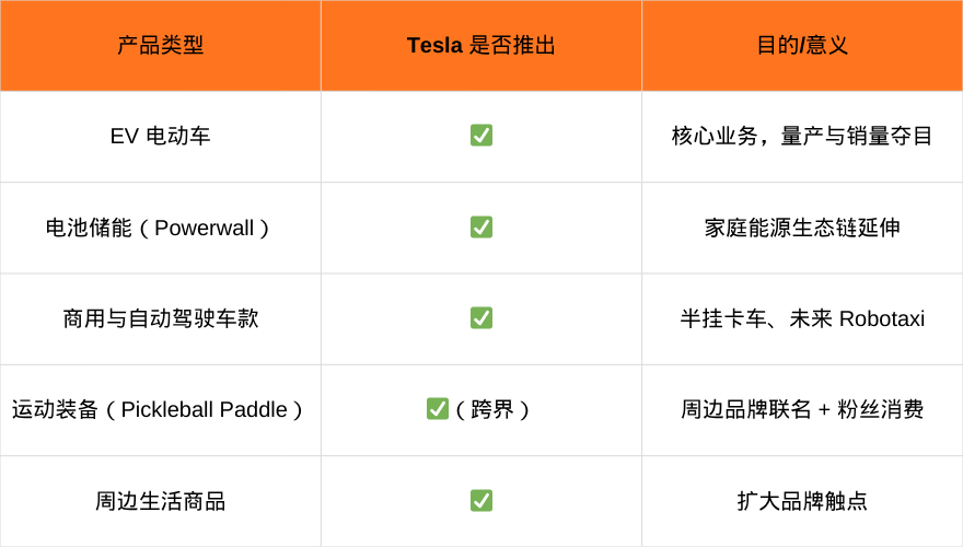 Tesla 的产品不是“只做车”,而是做一个“科技生活+能源+娱乐周边”生态。
