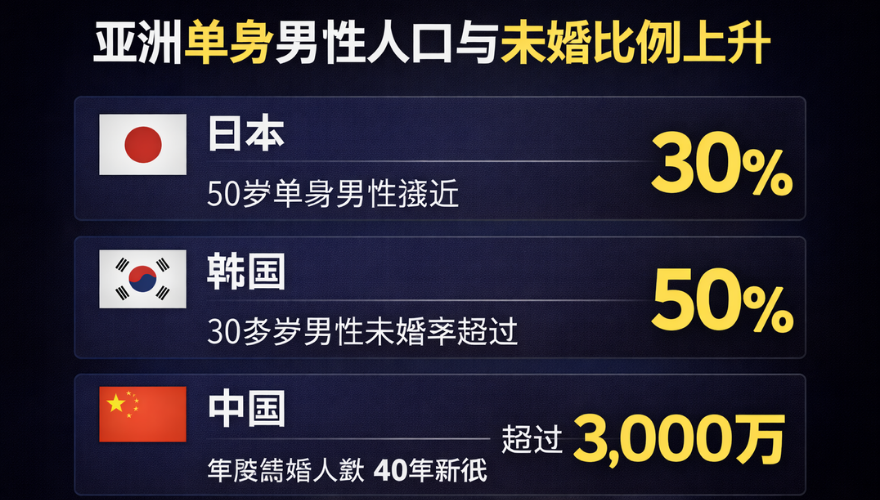 与此同步上升的,是亚洲单身人口比例。日本50岁未婚男性接近三成,韩国30多岁男性未婚率超过50%。中国结婚人数在近年创下40年来新低,单身男性人口被估计超过3000万。马来西亚方面,统计显示全国单身人口已接近44%,城市年轻男性未婚比例持续上升。