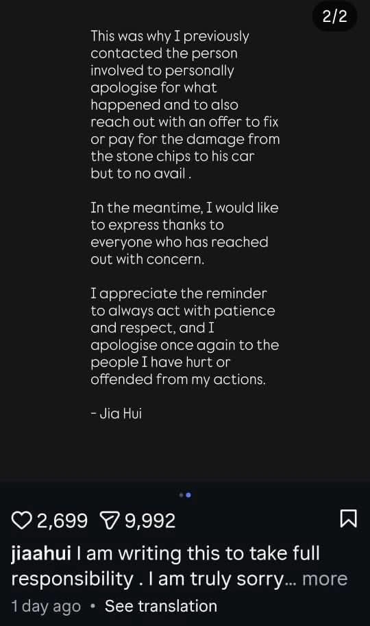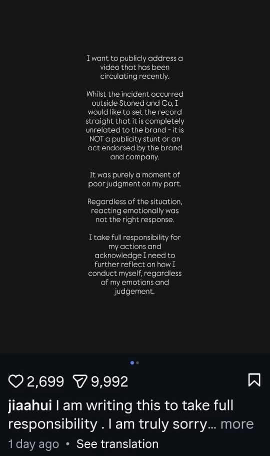 他确认自己就是视频中的 红色 Ferrari 车主,也是潮牌 Stoned & Co. 的联合创办人陈家辉(Tan Jia Hui),并表示:
