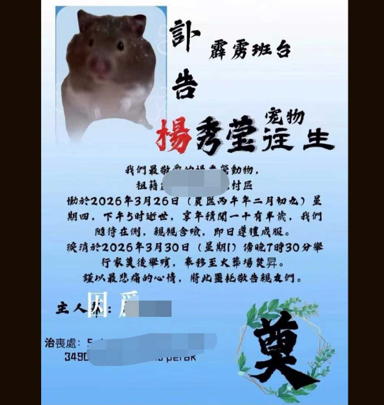 宠物仓鼠离世主人发讣告办告别式! 杨秀莹引发全网热议!